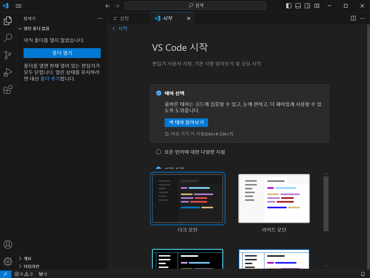 VS Code를 처음 실행한 모습입니다. 메인에서는 테마를 고를 수 있게 되어있습니다.