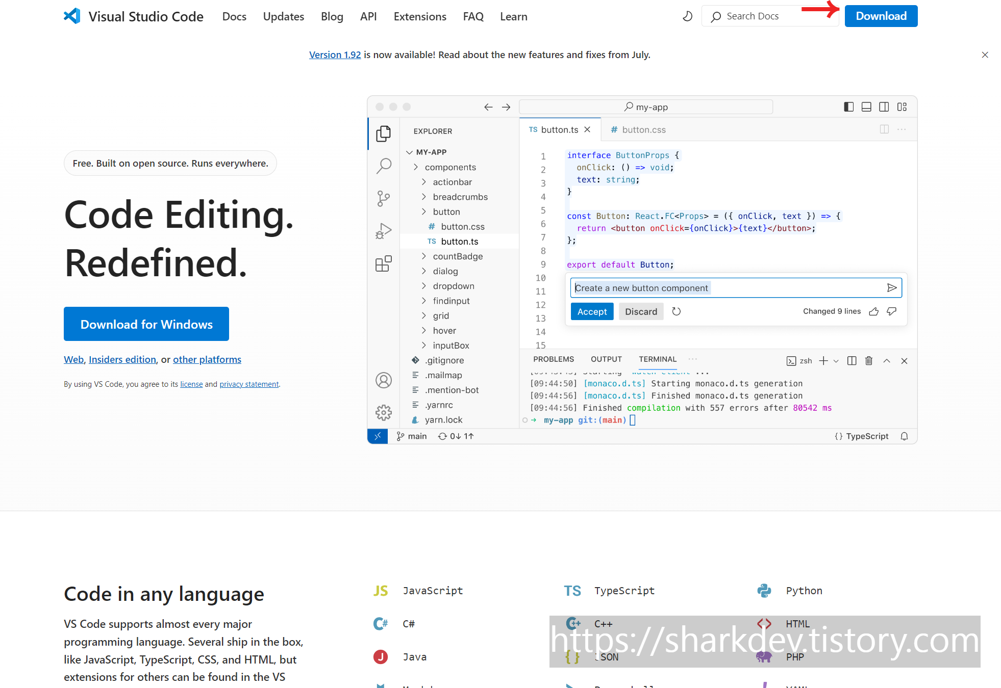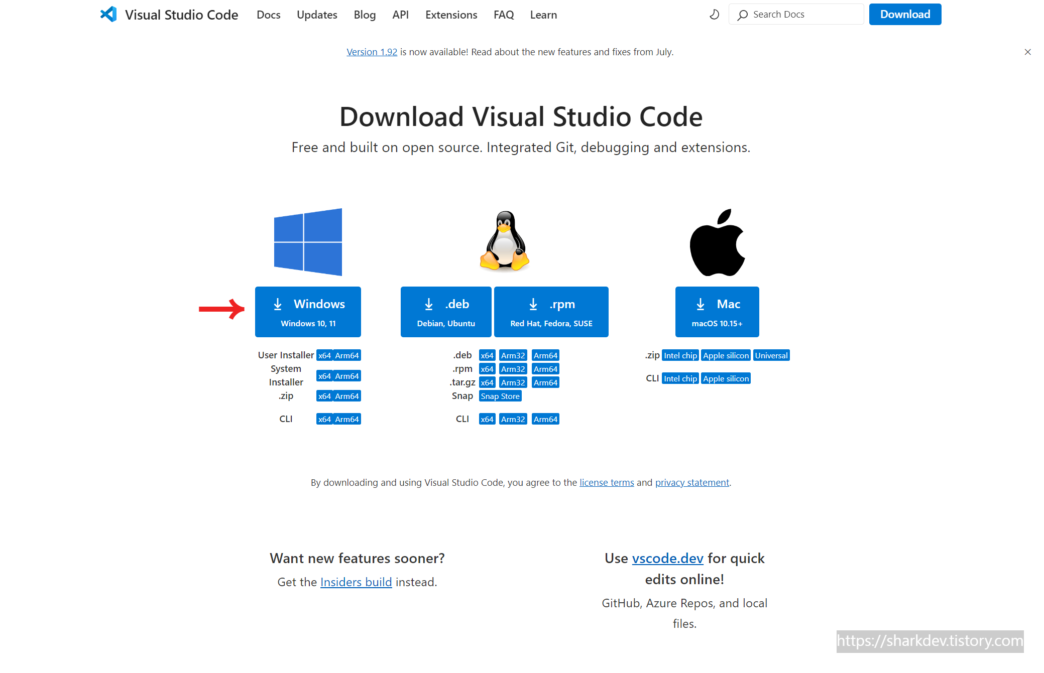 먼저, 아래 링크를 통해 비주얼 스튜디오 코드 공식 웹사이트에 접속합니다.