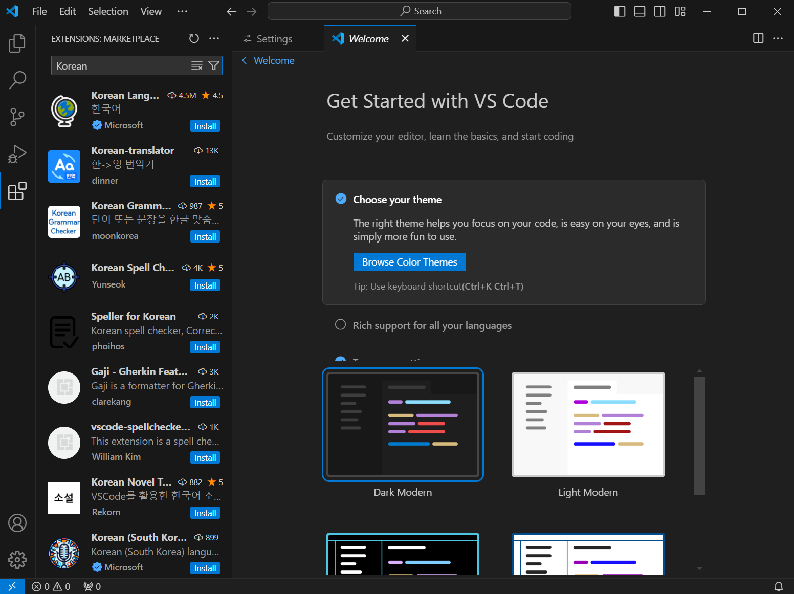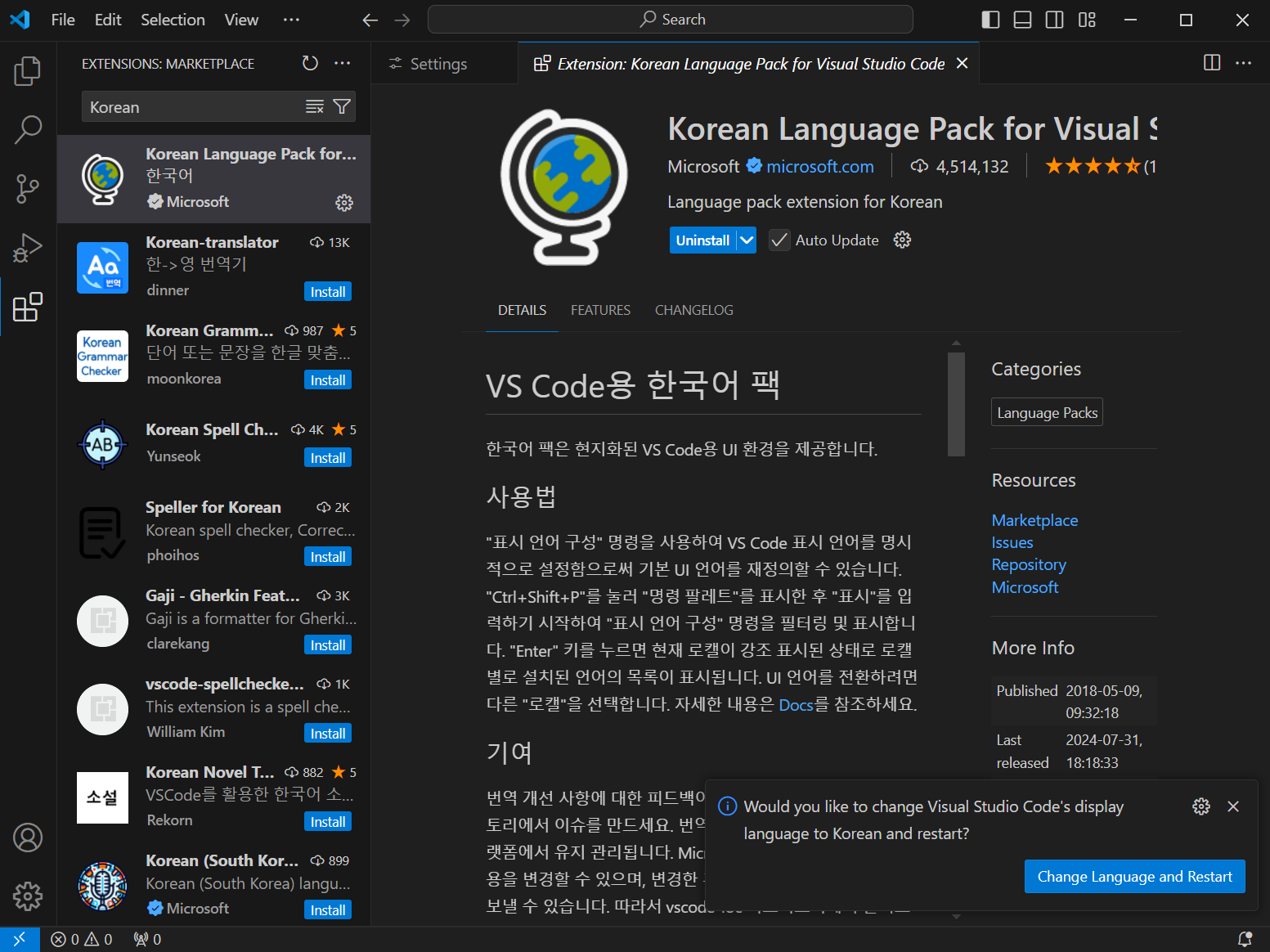 위 사진과 같이 마켓플레이스 검색창이 열리면 "Korean"을 검색해 가장 상단에 있는