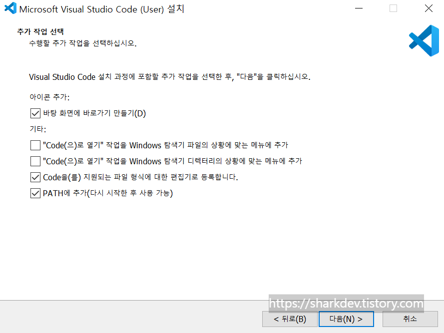 추가 작업 선택 화면에서는 옵션들을 확인하고 필요한 옵션들을 선택 후 다음을 통해 넘어갑니다.